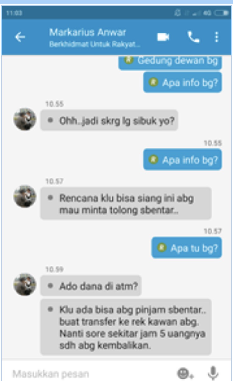 Salah satu isi chating di akun BBM Markarius Anwar yang telah di kuasai hacker.