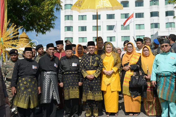 PEKANBARU,WARNARIAU.COM - Penabalan Gelar Datuk Seri Setia Amanah Masyarakat Adat Melayu Riau kepada Gubernur Riau, H Arsyadjuliandi Rachman oleh Lembaga Adat Melayu Riau (LAMR) dihadiri ribuan tamu undangan dan berlangsung khidmat, Rabu (15/3/2017). Dimulai dengan penjemputan dari kediaman Gubernur Riau untuk diarak berangkat menuju Balai Adat Melayu Riau, Jalan Diponegoro Pekanbaru. Arak-arakan ini disambut oleh tujuh Pejawat adat dan kelompok musik kompang.