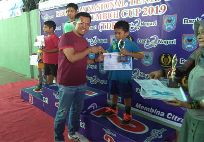 Wakil Walikota Payakumbuh, Riza Falepi menyerahkan medali pada kejuaraan Nasional Tennis Junior, Payakumbuh Cup.