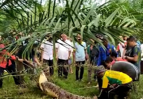 Menurut Camat, diduga buaya itu naik ke darat karena air sungai surut, dan syukur Alhamdulillah tidak memakan korban.