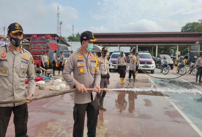 INHU, WARNARIAU.COM - Kapolres Inhu AKBP Efrizal SIK memimpin langsung giat Apel Sarana Prasarana (Sapras) dalam rangka pencegahan/penanggulangan Karhutla di wilayah Inhu, Kamis (11/6/2020) pukul 08.00 WIB di halaman Apel Polres Inhu.