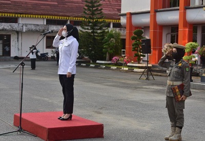 INHU, WARNARIAU.COM - Bupati Indragiri Hulu Rezita Meylani Yopi, pimpin upacara di Halaman Kantor Bupati Indragiri Hulu, Rabu (7/7/2021) untuk pertama kalinya usai dilantik jadi Bupati.