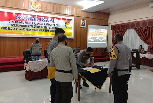 Kapolres Kuansing AKBP Henky Poerwanto, SIK, MM menegaskan bahwa Pakta Integritas yang sudah ditandatangani merupakan komitmen dalam penggelolaan dan pengunaan anggaran Polres Kuansing tahun 2021. Anggaran yang telah dialokasikan tersebut harus dapat dikelola dengan sebaik-baiknya sesuai ketentuan dan peraturan perundang-undangan yang berlaku dalam rangka mendukung sepenuhnya pelaksanaan program dan kegiatan yang telah ditentukan.