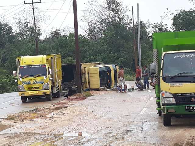 Mobil Truck Pengangkut Karet Terbalik di Jalan Lingkar Sungai Rumbio Kari - Sungai Jering