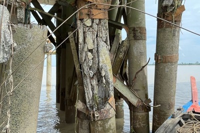 Alamak! Tiang Jembatan Padamaran Remuk Ditabrak Kapal, Lalu lintas dibatasi