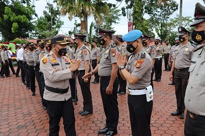 ROKAN HILIR - Kapolres Rohil, AKBP Nurhadi Ismanto pimpin upacara kenaikan pangkat 80 Personel Polres Rohil dan 12 Personel Batalyon B Sat Brimob Polda Riau.