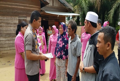 Bantuan berupa sembako dan uang santunan, diberikan langsung Ketua Bhayangkari Cabang Rohul Evie Dasmin didampingi Kapolres Dasmin Ginting. (halloriau)