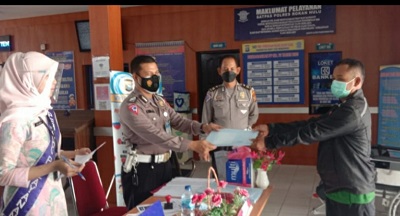 Pelayanan SIM keliling dilakukan dengan menerapkan protokol kesehatan. Salah satunya menggunakan masker dan tetap jaga jarak dengan pemohon lainnya.