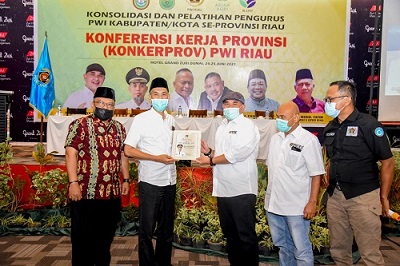 DUMAI, WARNARIAU.COM - Persatuan Wartawan Indonesia (PWI) Riau menggelar Konferensi Kerja (Konkerprov) 2021 di Hotel Grand Zuri Dumai, Kamis-Jumat (24-25/6/2021). Ketua Umum PWI Pusat Atal S Depari langsung membuka secara virtual agenda yang membahas dan mengevaluasi program kerja PWI Riau.